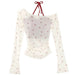 This aesthetic mesh top features delicate red bow prints. an off-shoulder neckline. and flared sleeves