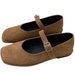 These vintage-inspired Mary Jane flats feature a timeless silhouette with soft suede texture and an adjustable strap