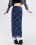 A stylish blue plaid maxi skirt with a high-waist design and drawstring closure. The skirt features a checkered pattern in varying shades of blue. creating a modern yet classic look. Its long. straight silhouette provides a sleek and elegant appearance. perfect for both casual and semi-formal occasions