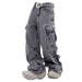 These 00's Aesthetic Wide Leg Cargo Jeans have a denim construction. argo pockets. and a front button and zip closure.