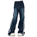 This blokette aesthetic wide-leg jeans features contrasting white side stripes that extend the full length. a deep blue wash. and a high-waist fit