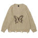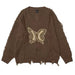 This distressed butterfly sweater combines earthy tones with a bold butterfly accent on the front. Frayed edges and a soft knit texture make it ideal for a laid-back. nature-inspired outfit