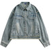 This aesthetic jean jacket featuring a vintage-style wash. oversized cut with structured shoulders. and a textured butterfly patch on the back made of layered frayed fabric. Finished with exposed seams and cuffed sleeves