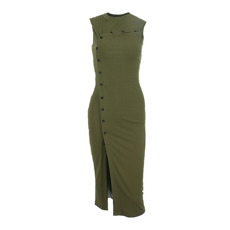 Button hollow out sleeveless ribbed slit 2-way midi dress