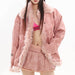 This Campus Queen jacket features dusty pink faux suede construction with fluffy shearling trim along the edges and collar
