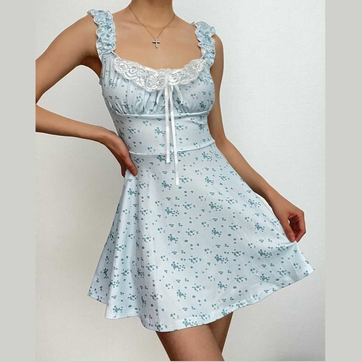 Cap sleeve lace hem ruched flower print contrast mini dress