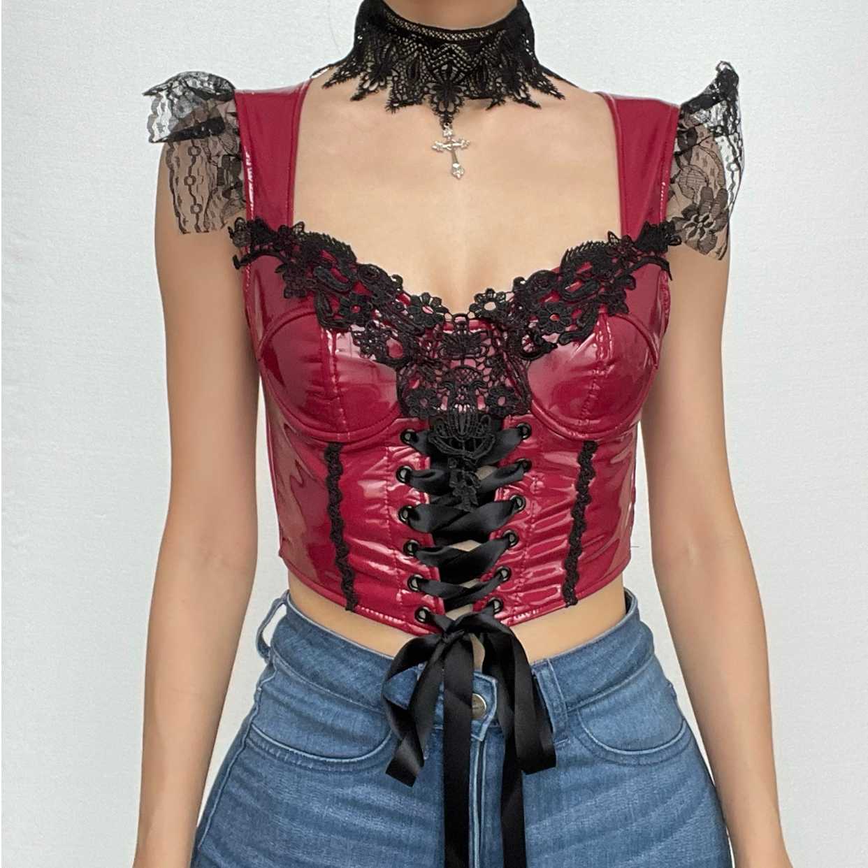 Cap sleeve v neck lace hem PU leather lace up crop top
