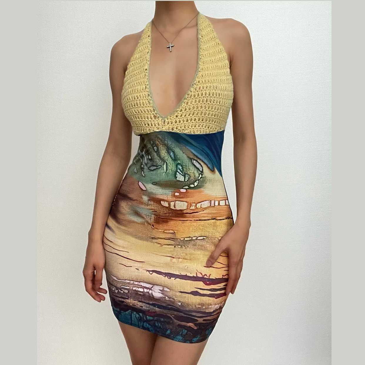 Contrast abstract print halter crochet patchwork v neck mini dress