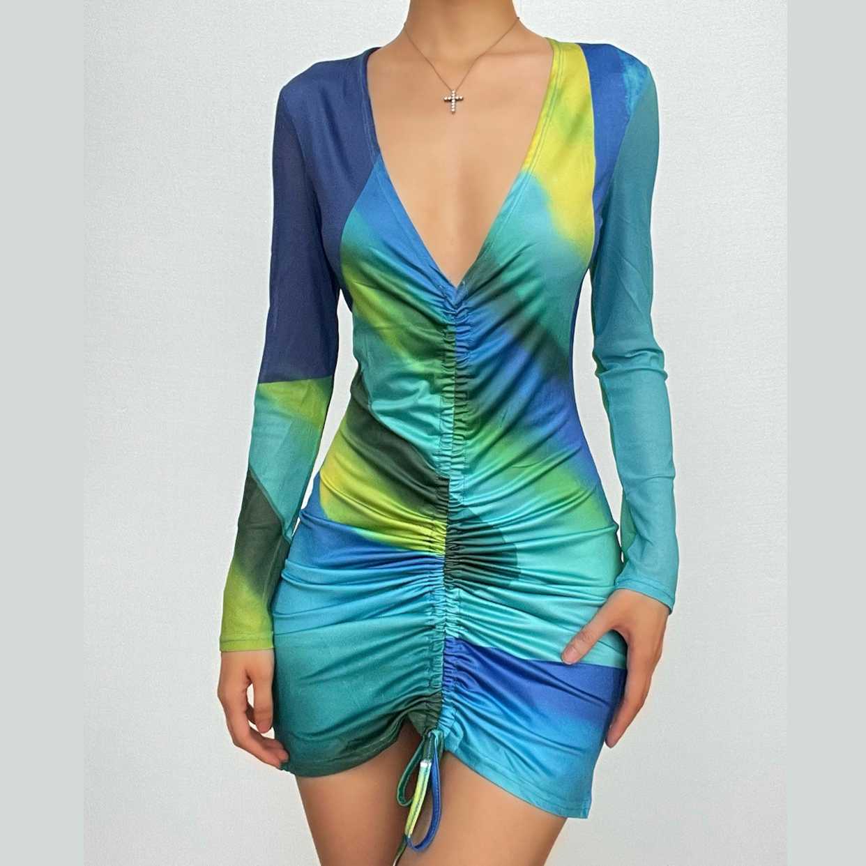 Contrast print drawstring long sleeve v neck ruched mini dress