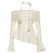 This stunning off-shoulder top featuring delicate ruched detailing and a statement rose choker. Its asymmetrical peplum hem and flared cuffs add a romantic touch.