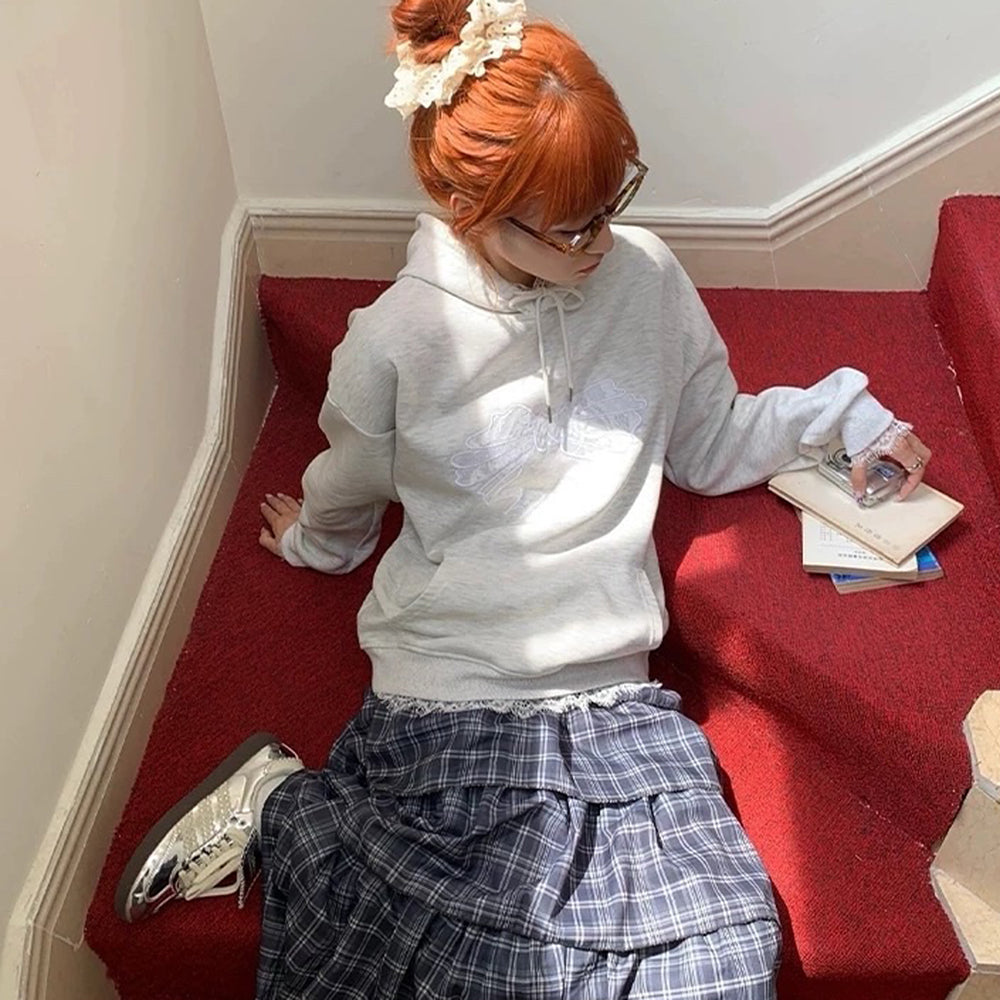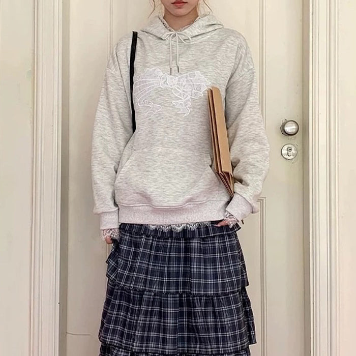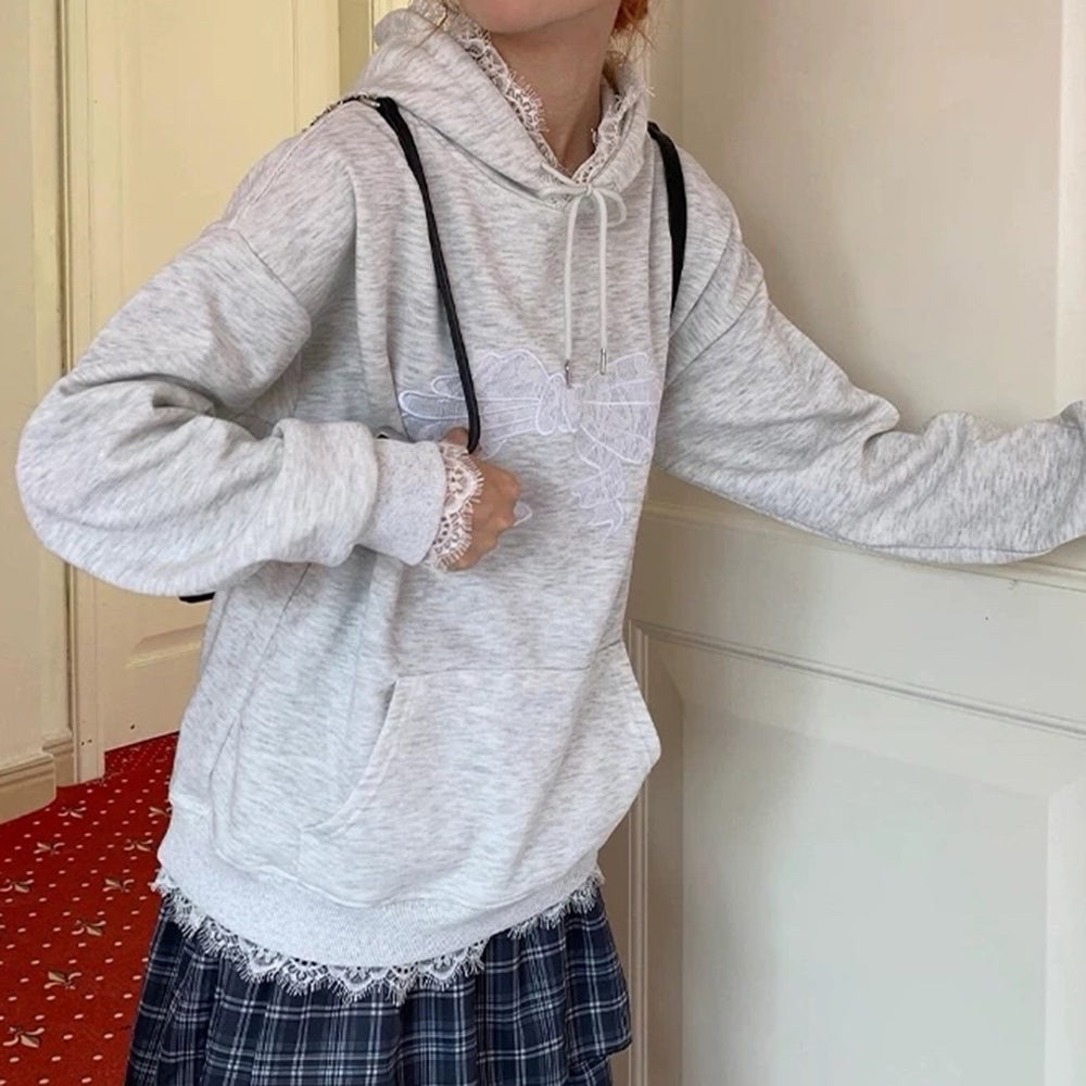 This coquette aesthetic hoodie features an oversized fit. lace trim around the hood. and a delicate embroidered bow on the front. Made from soft. comfortable fabric