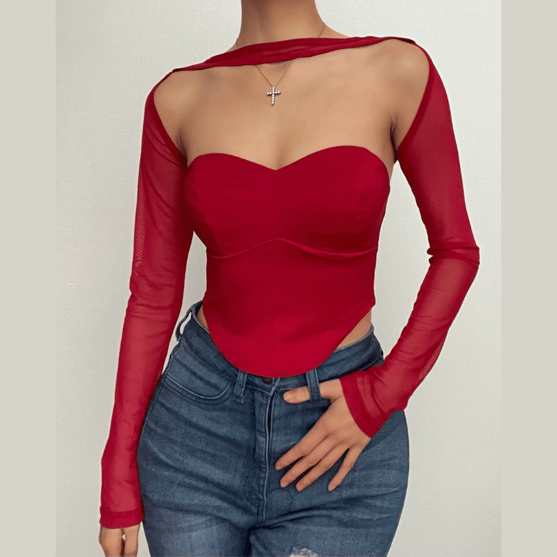 Corset solid mesh long sleeve 2 piece shrug crop top