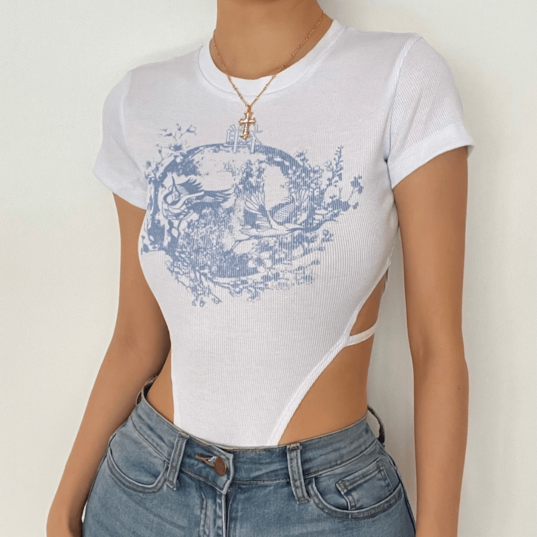 Crewneck short sleeve print hollow out bodysuit