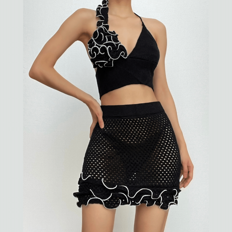 Crochet ruffle irregular halter contrast v neck backless mini skirt set
