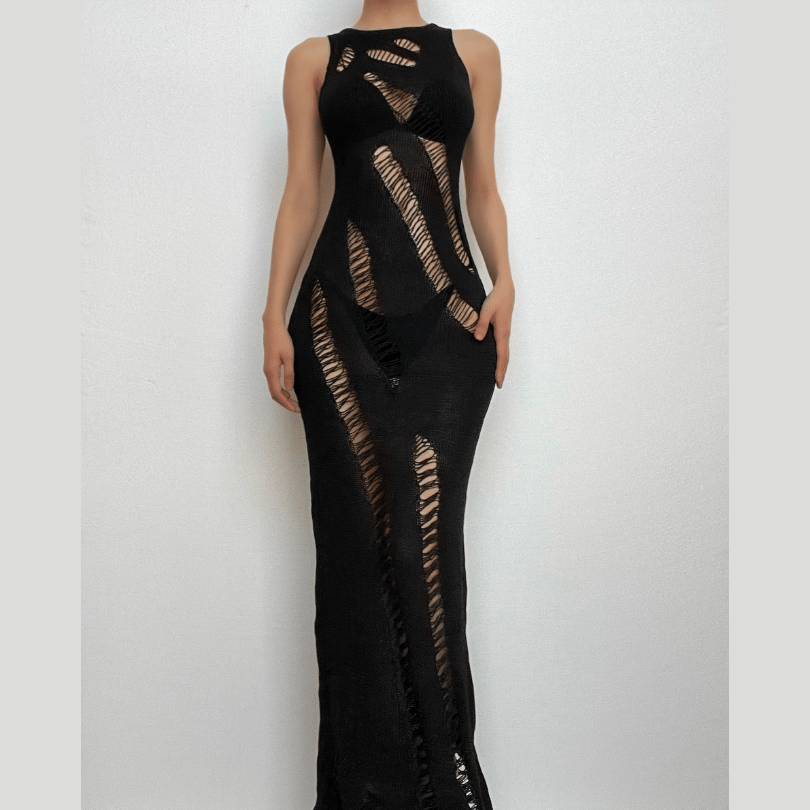 Crochet solid hollow out sleeveless irregular maxi dress