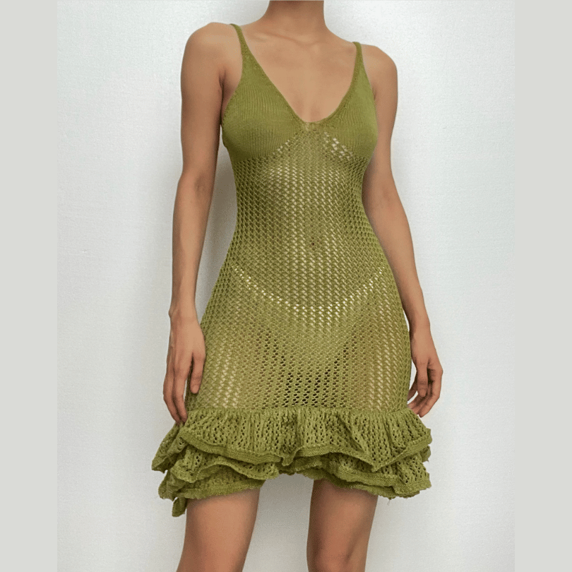 Crochet v neck sleeveless hollow out ruffle mini dress