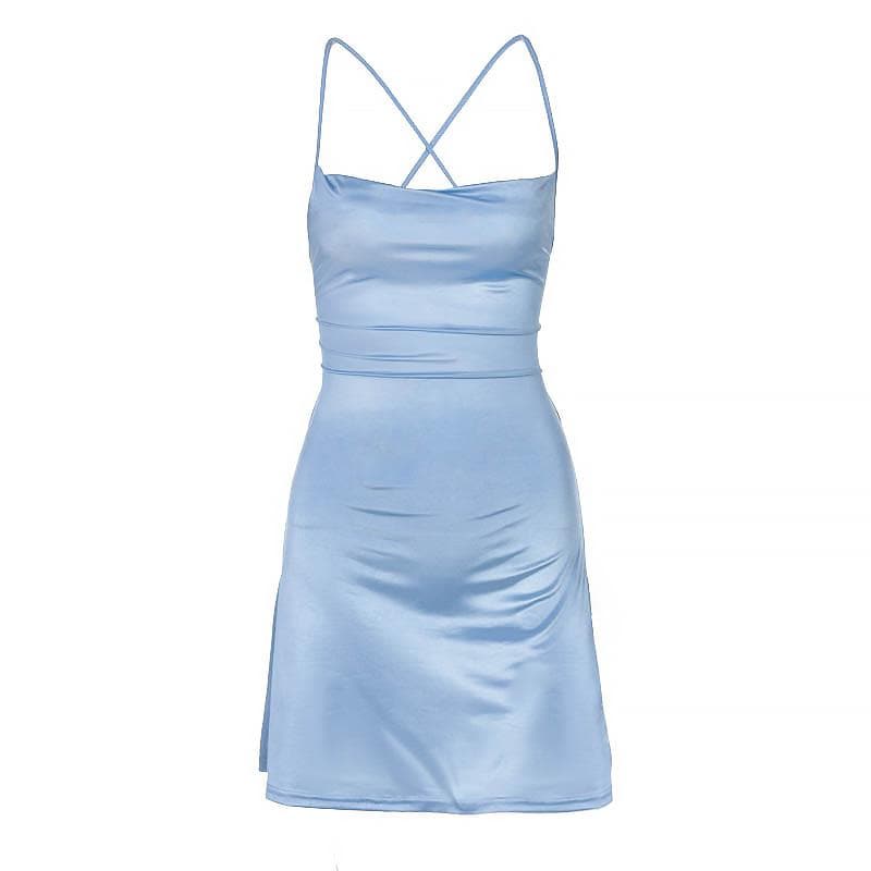 Cross back solid satin cowl neck lace up self tie backless mini dress