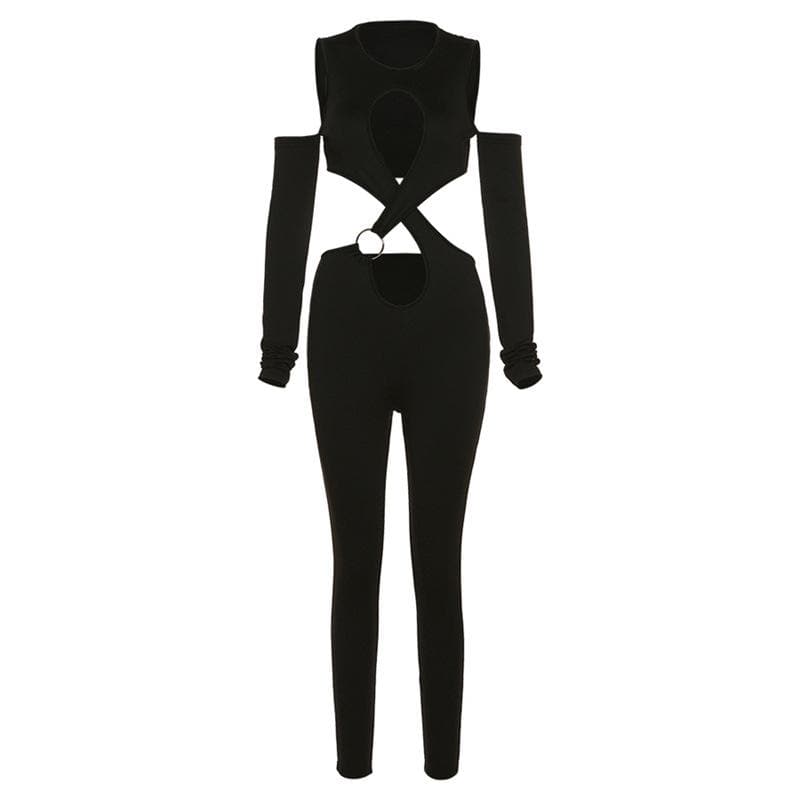Cross front long sleeve hollow out off shoulder o ring solid jumpsuit