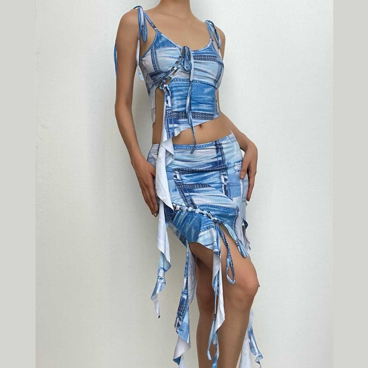 Denim print contrast ruffle lace up irregular self tie mini skirt set