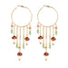 These earrings feature gold hoops adorned with dangling mushrooms. accented by orange beads and small green leaves for a whimsical and fairy-inspired look