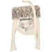 This off-shoulder top featuring long flared sleeves. fuzzy leopard-print faux fur across the neckline. and a fitted cream body with black punk-style lettering and abstract line prints across the front