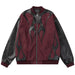 This Fiery Bomber Jacket features bold black flame designs on the front and a leather sleeves. The zip-up front and ribbed cuffs provide a sleek and edgy look