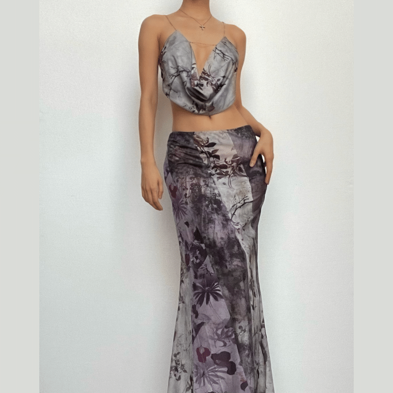 Flower print contrast cowl neck ruched cross back backless midi skirt set