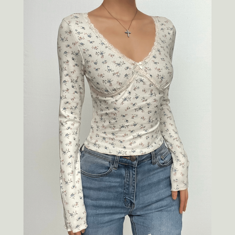 PRE ORDER - Flower print contrast long sleeve v neck lace hem top