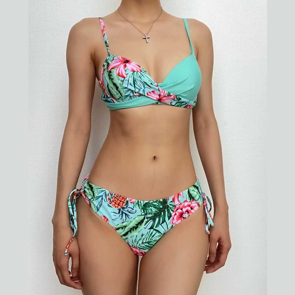 Flower print cross front padded self tie cami bikini swimwear