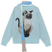 This aesthetic knit sweater features a fluffy Siamese cat graphic on a soft blue background. with an oversized fit and ribbed cuffs for a cozy look