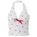 This cute halter top features a cherry print. lace trim. and a red ribbon bow