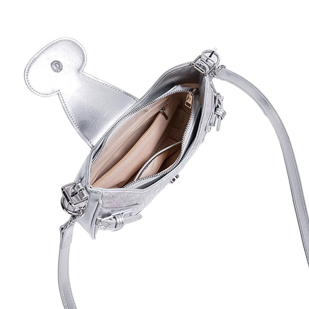 Chic silver shoulder bag featuring an eye-catching oval buckle and textured accents