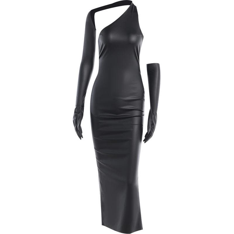 Gloves solid PU leather irregular one shoulder slit midi dress