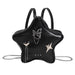 A black star-shaped backpack featuring silver charms including a butterfly outline. a heart with a chain. and a star. It has adjustable shoulder straps and a zipper closure