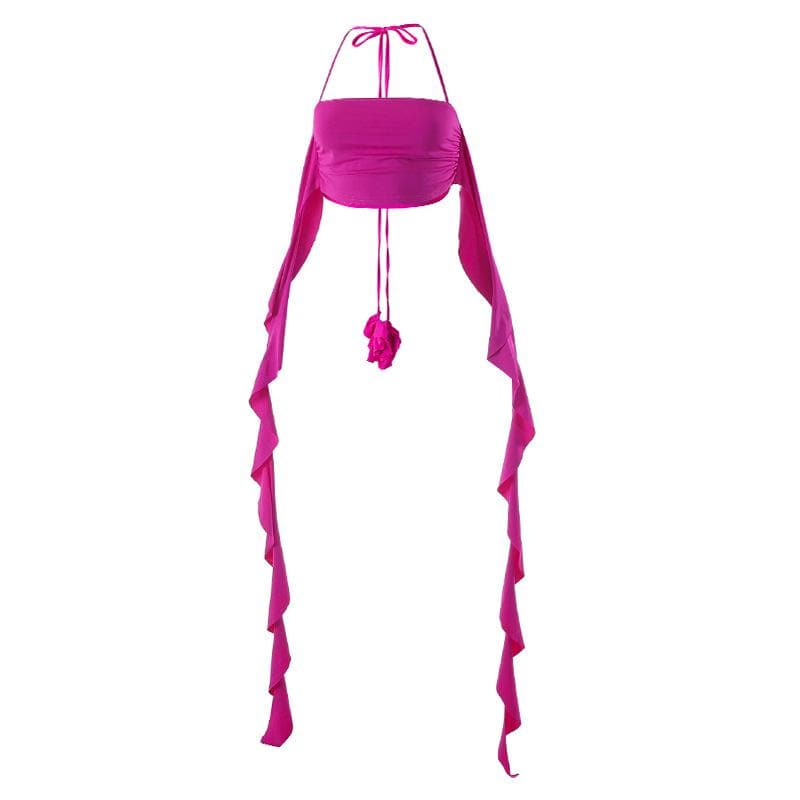 Halter sleeveless solid ruffle self tie ribbon crop top