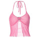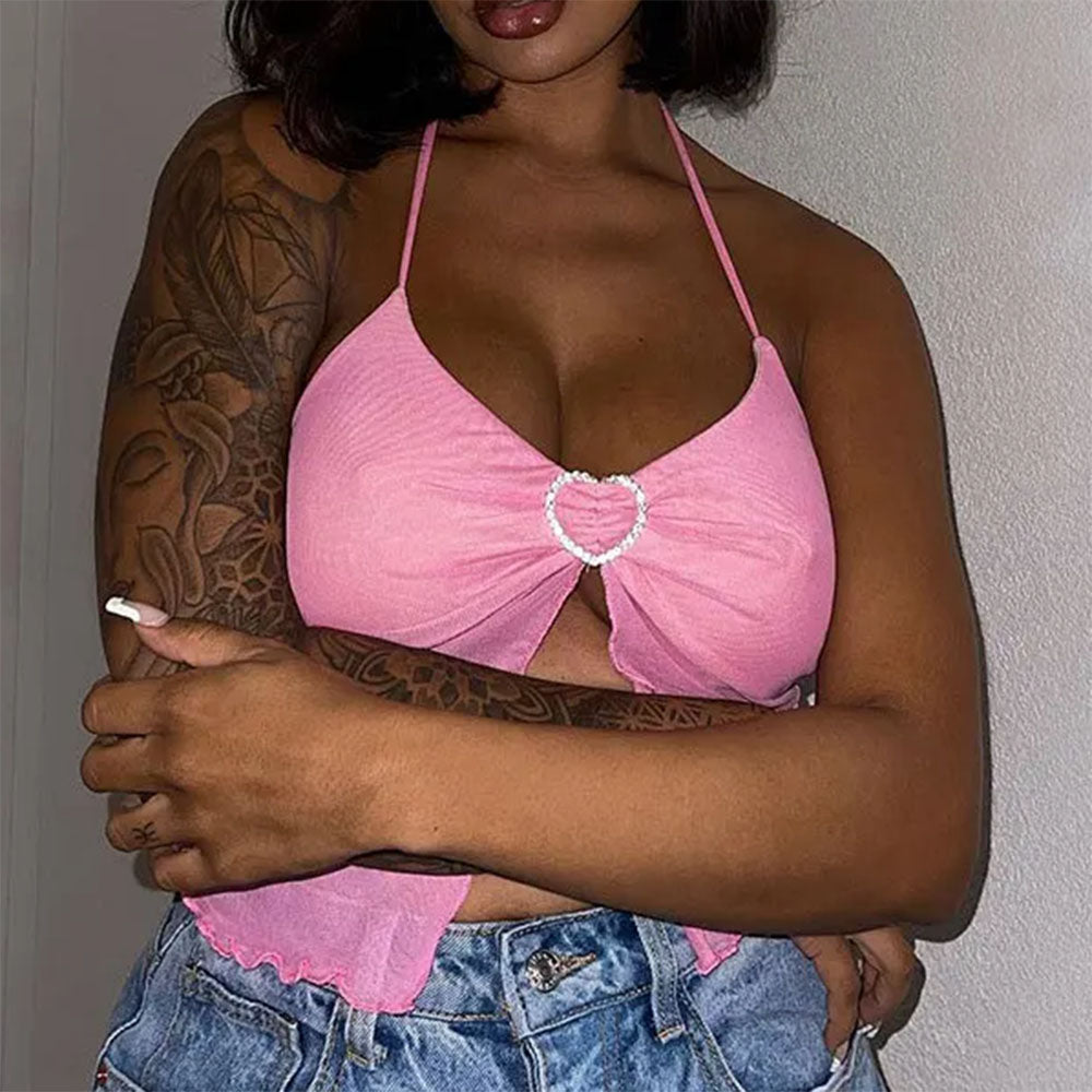 Y2K Style pink halter top featuring a rhinestone heart-shaped buckle and adjustable neck tie. with a flowing. lightweight design
