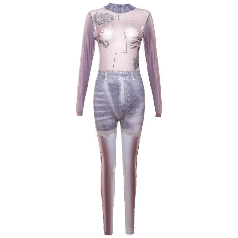 High neck denim print long sleeve zip-up mesh patchwork jumpsuit