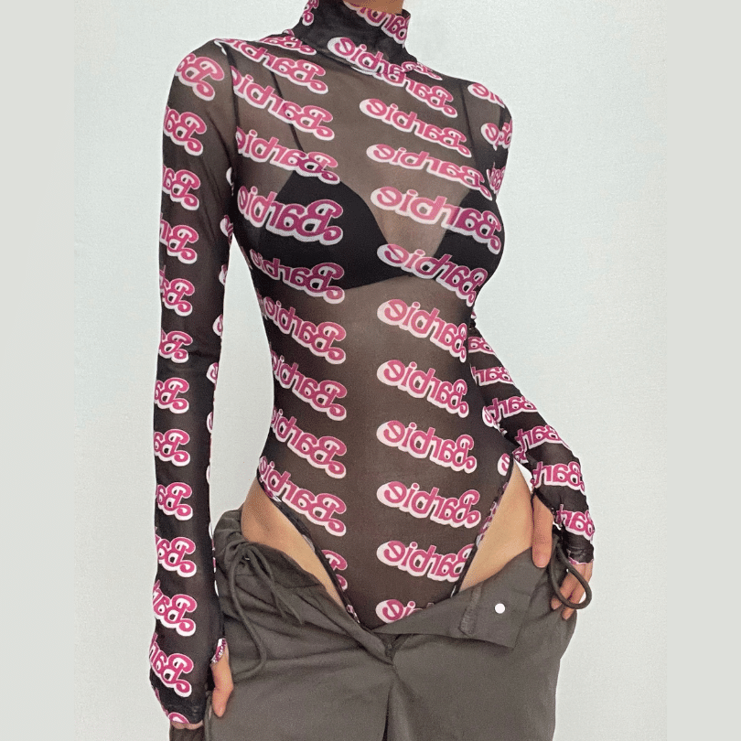 High neck long sleeve barbie print sheer mesh see through bodysuit