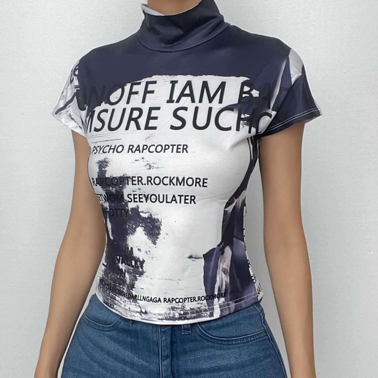 High neck short sleeve letter print contrast top