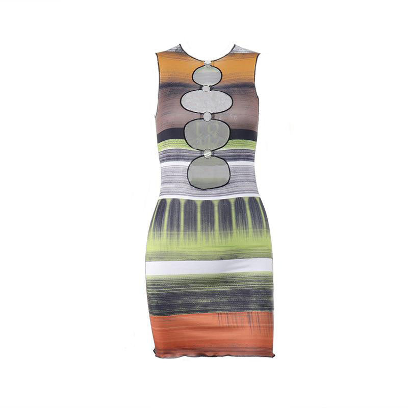 Hollow out contrast print o ring sleeveless ruffle mini dress
