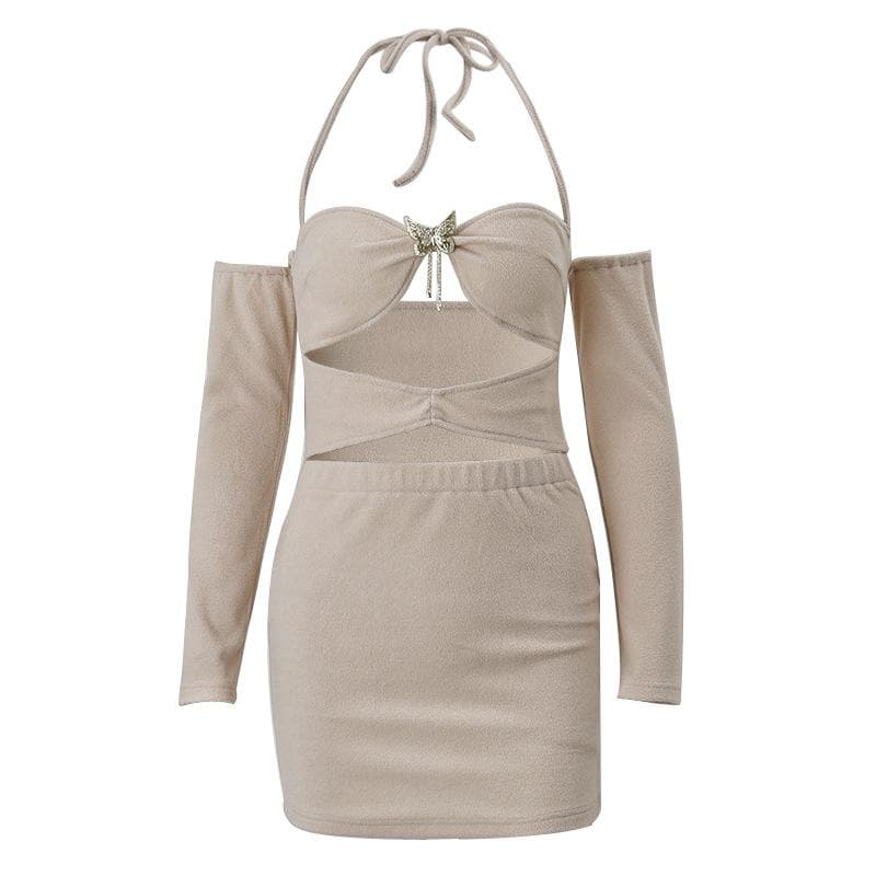 Hollow out halter solid long sleeve backless butterfly applique mini dress