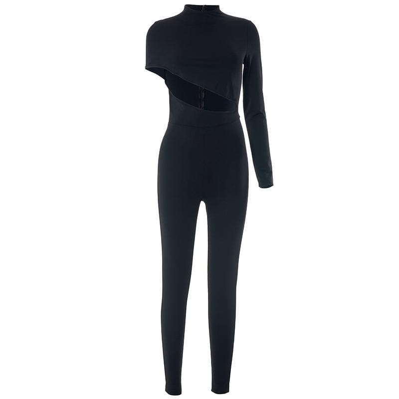 Hollow out irregular long sleeve high neck solid jumpsuit