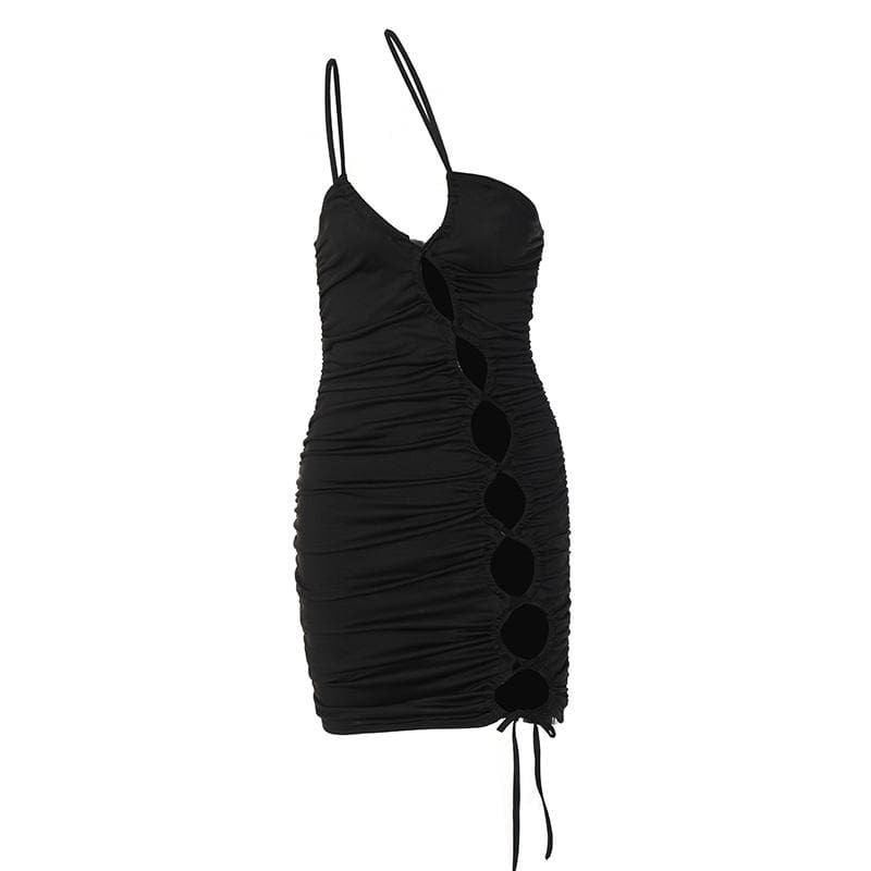 Hollow out ruched solid one shoulder self tie backless mini dress