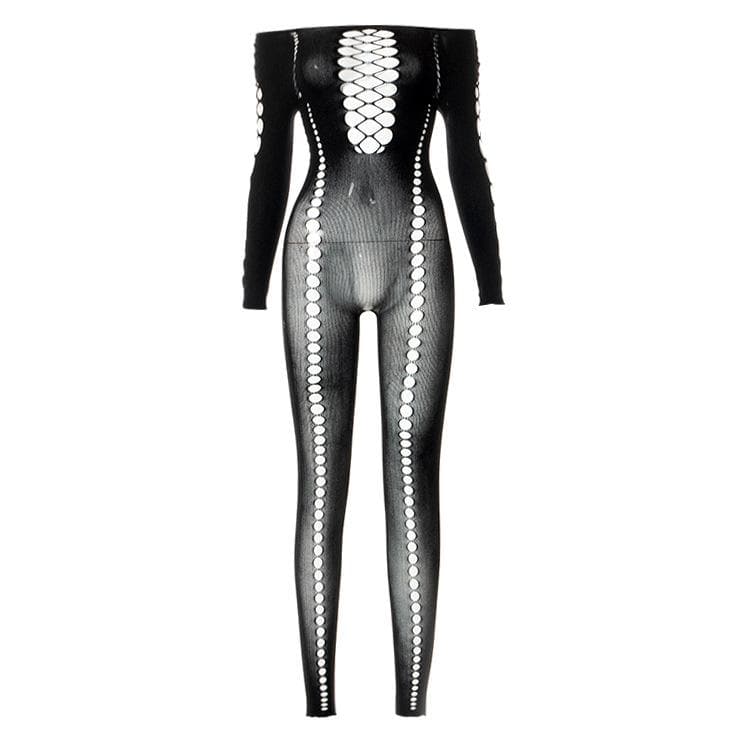 Hollow out solid fishnet off shoulder long sleeve jumpsuit