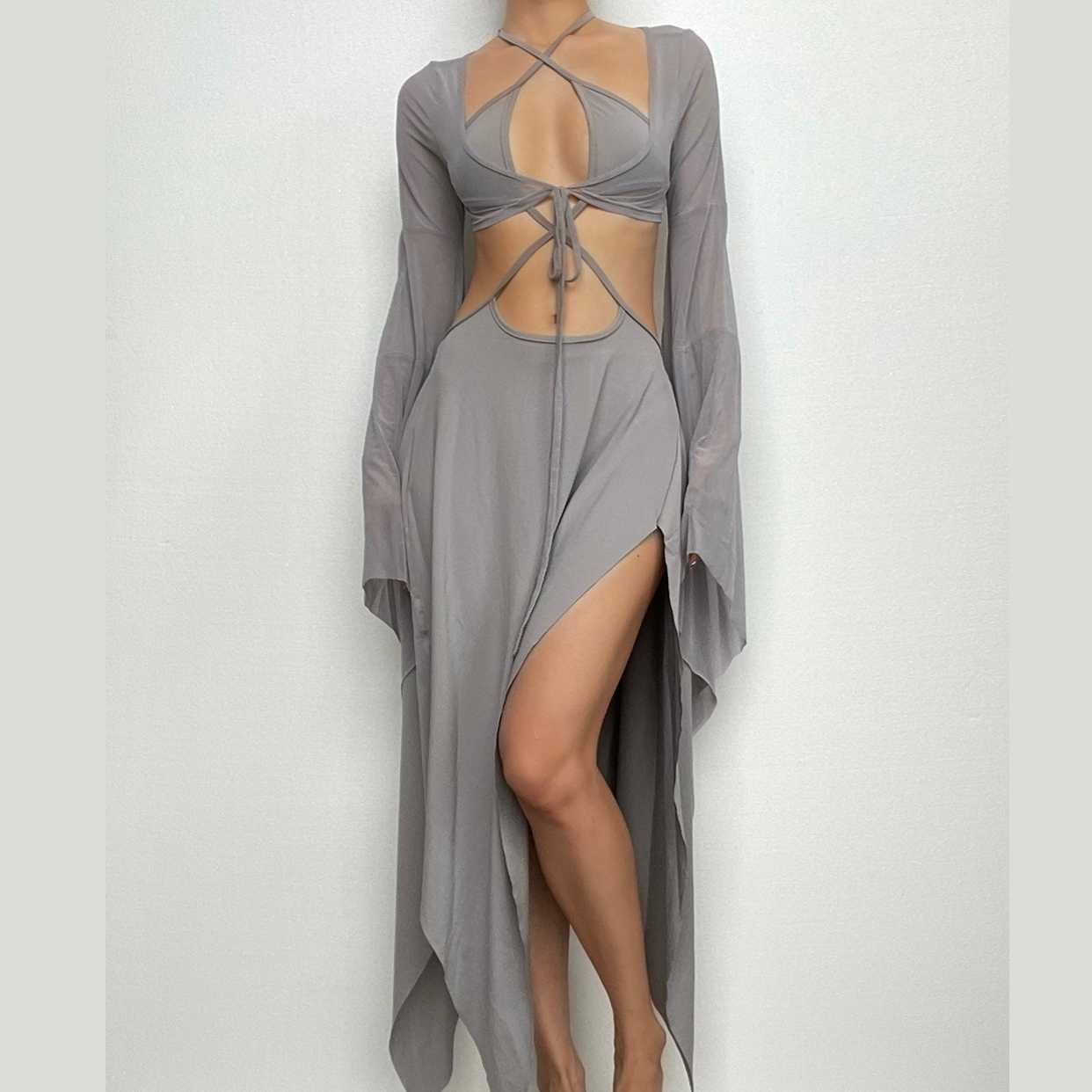 Irregular flared sleeve halter self tie solid mesh shrug midi dress