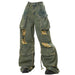 These distressed cargo jeans feature large utility pockets. a wide-leg fit. and heavy rips with raw edges