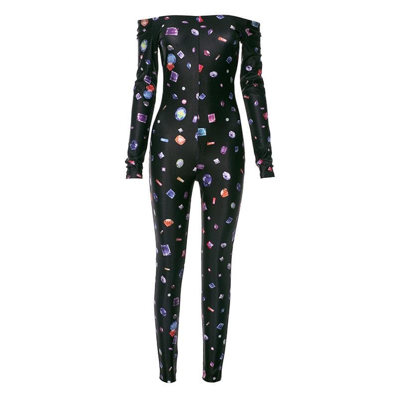Jewel print off shoulder contrast long sleeve jumpsuit