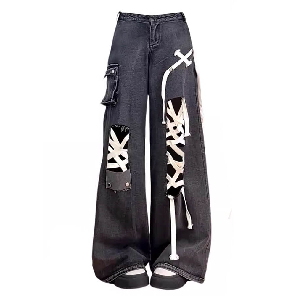 Black wide-leg jeans with a bold coquette aesthetic. featuring white lace-up details along the legs and patch pockets. The dark wash is accented with contrasting stitching and metal hardware.