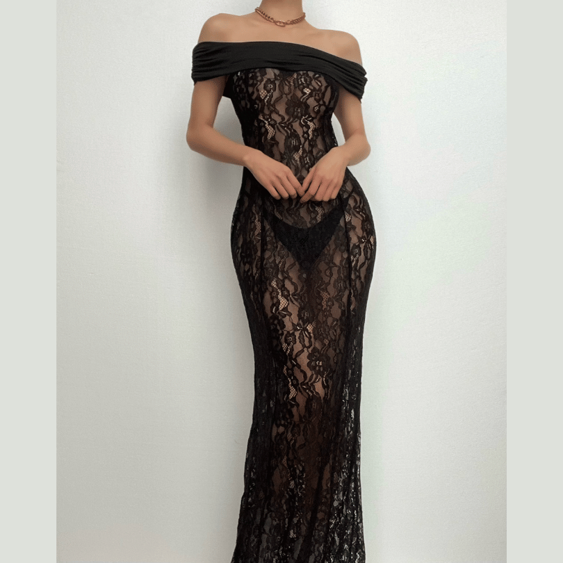 Lace off shoulder see through solid ruched maxi dress