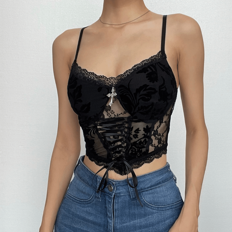 Lace patchwork solid cross applique lace up crop top